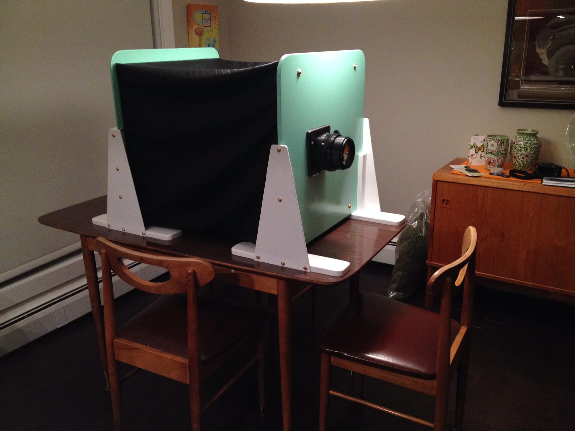 These are the only remaining images of the 'camera' itself. I recycled it a few years after the shoot, not having anywhere to keep it. What's hard to see is that on the far side of the huge processing lens is a hole, and that hole is where I would mount my digital SLR. The camera obscura projected an image on the back surface and the digital camera recorded it. Looks fancy, eh? It was, however, a beast to use.