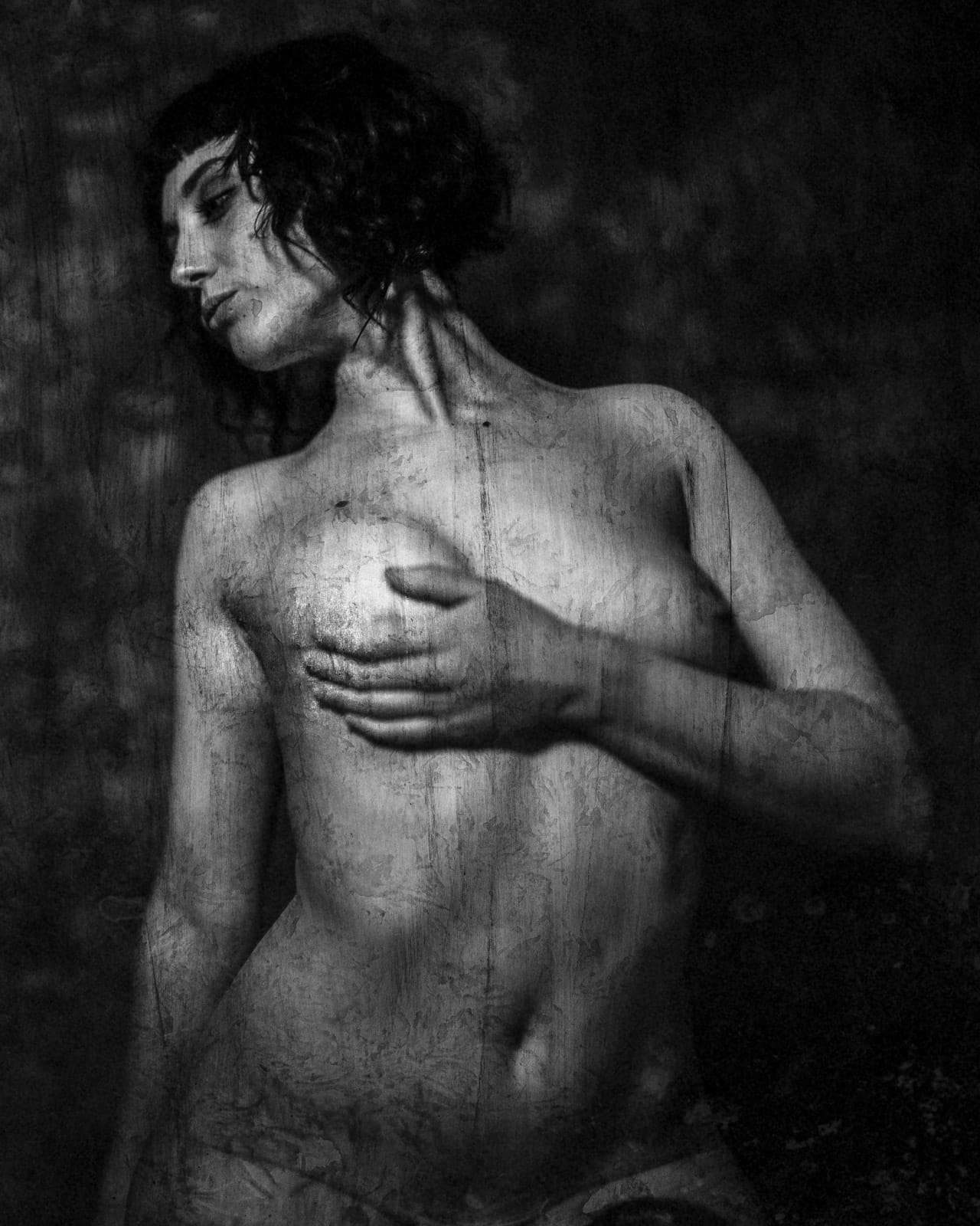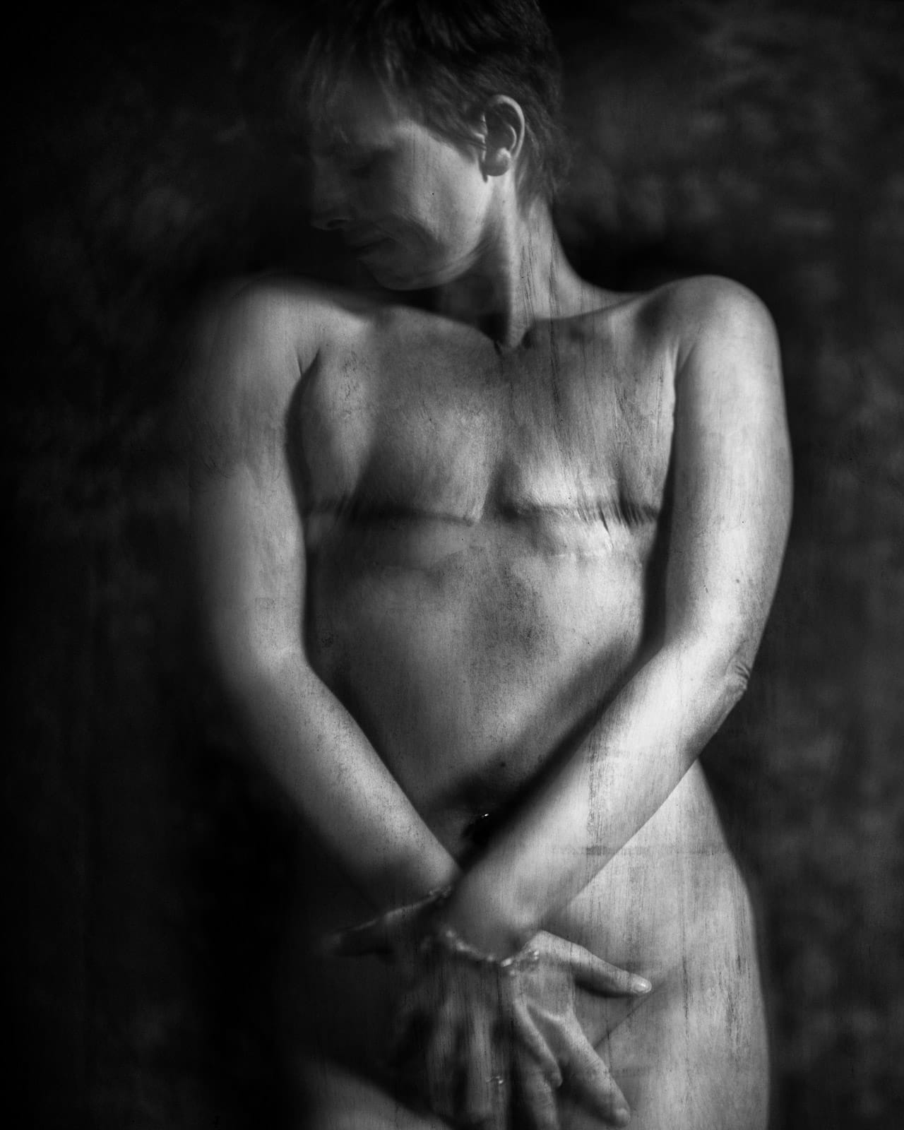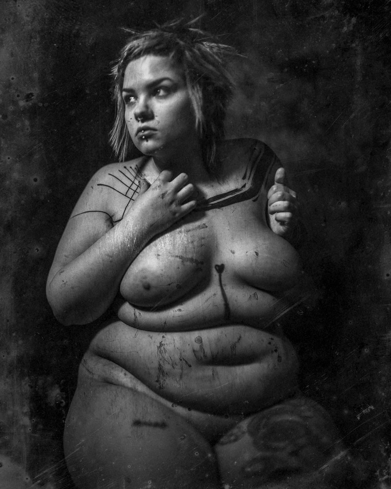 It was a fixed focal length and had a depth of field of fractions of inches. So I used the old school method of attaching a string to the front of the camera, and this is where the different participants would position themselves. On the back plate of the obscura I would draw scratches with charcoal pencils, ink marks, watercolor, etc. This was to give the images some texture, replicating that surface look you see on wet plates. I would print the images then add more scratches, etc., then scan again. Yeah, a very convoluted process. I love the results, not so much working with this camera.